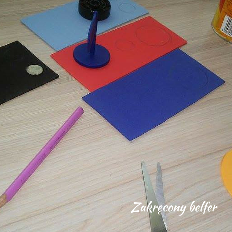 Zaczęliśmy od przygotowania kółek, które miały stać się planetami. Panicz znalazł w swoim otoczeniu różne przedmioty o przekroju koła, posiadające zróżnicowaną średnicę, które obrysowywaliśmy na piance. Tak przygotowane kontury wycieliśmy.
