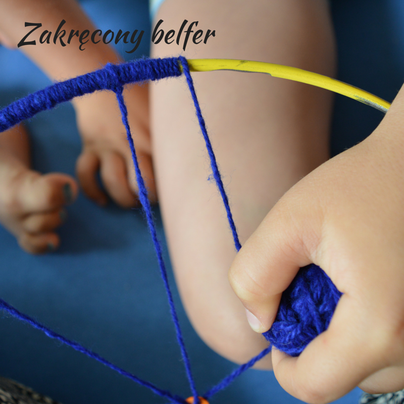 Następnie owinęliśmy całą obręcz, miejsce przy miejscu, włóczką (prawdziwym mistrzem okazał się Panicz, któremu zadanie to przypadło w udziale). Zabezpieczyliśmy w ten sposób nitki przed przesuwaniem się i zadbaliśmy o estetyczny wygląd naszej ozdoby 😀