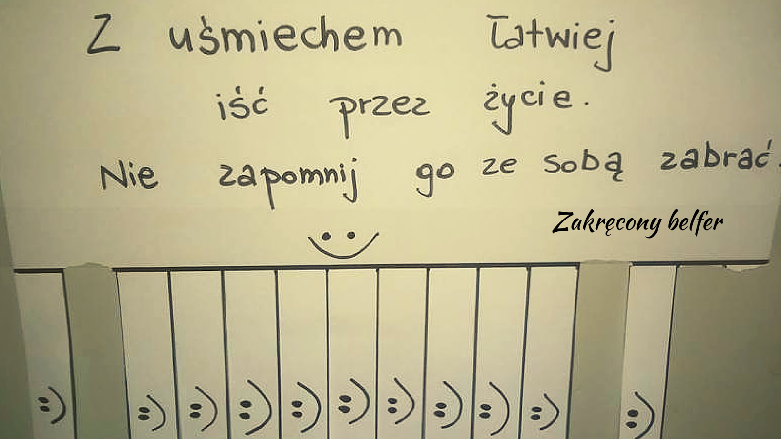Od pewnego czasu na drzwiach mojej pracowni zawieszam “uśmieszki do wzięcia”. No wiecie, coś na zasadzie ogłoszenia, w którym zamiast numeru telefonu, który można oderwać i włożyć do kieszeni, odrywa się uśmiech.