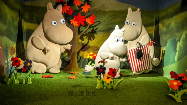 A tam, na całej niemal dostępnej przestrzeni, królują postaci z kultowych animacji mojego dzieciństwa (choć przyznam nieskromnie, że Pisklęta miały już niejedną okazję, aby tych bohaterów spotkać, choć zwykle na kartach książek – takie zboczenie zawodowe, hehe). Jest Miś Uszatek, przewyższający swą posturą Jaśnie Panienkę. Są: Muminki, Baltazar Gąbka i Szpieg z Krainy Deszczowców. Nie zabrakło również Reksia, Pik-Poka, czy Zaczarowanego Ołówka. Wieka szkoda, że animacja z tym ostatnim nie działała tak, jak powinna i nie mogliśmy znaleźć się w jednym kadrze z Piotrkiem i jego wiernym psem (będziemy mieli powód, aby odwiedzić to niezwykłe miejsce kolejny raz).
