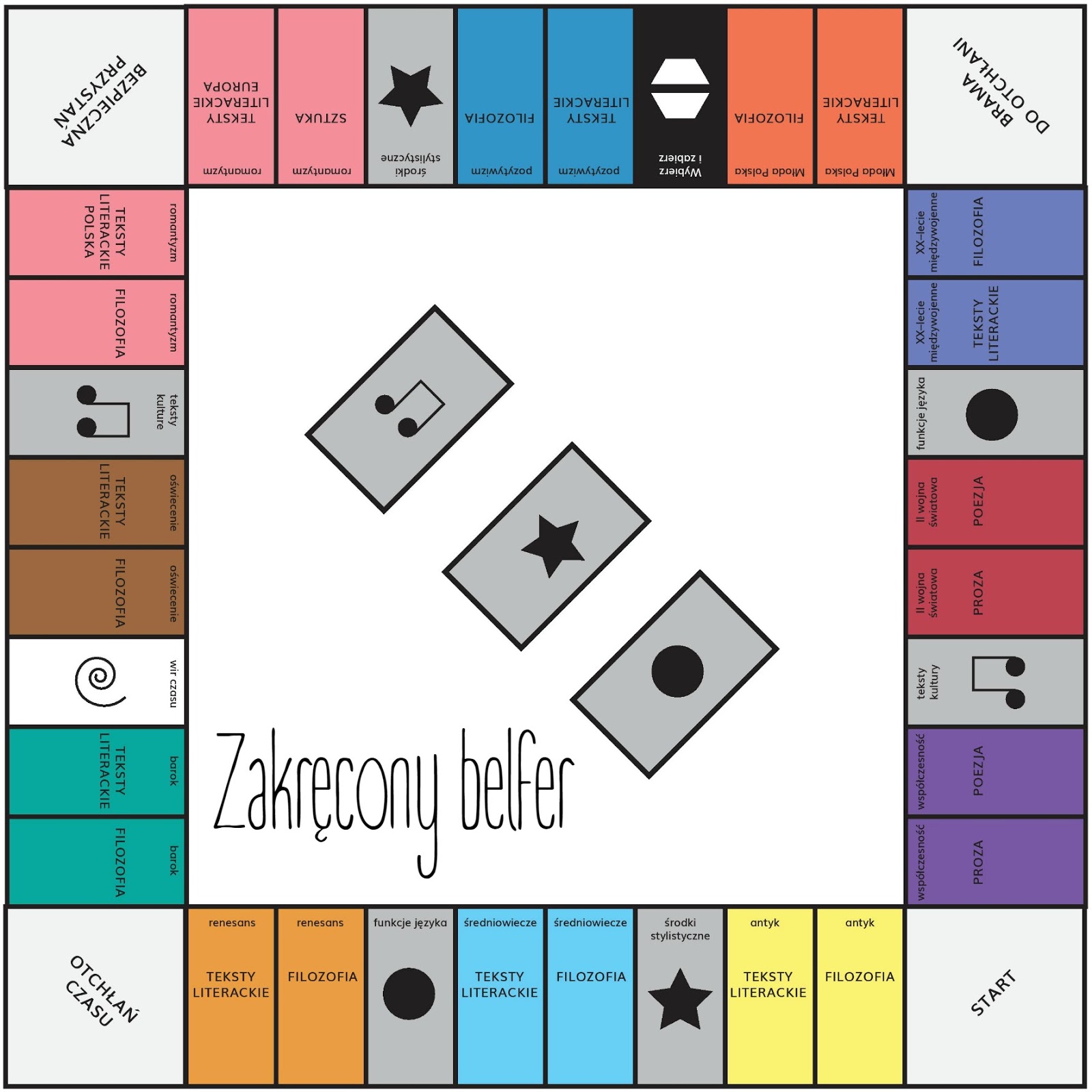 Niniejszym przedstawiam Wam grę: “Przez epoki”, której nadrzędnym celem jest powtórzenie wiadomości historyczno- literackich w formie zabawy. Dzięki polom specjalnym (np. “tekstowi kultury”, czy “funkcji języka”) można sobie pomóc w rozgrywce. “Wir czasu” przenosi nas na dowolnie wybrane pole, a “Wybierz i zabierz” umożliwia pokrzyżowanie planów innym graczom.
