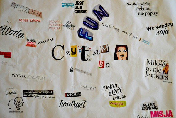 Kolejnym z elementów prezentowanych w trakcie piątkowego zgromadzenia będzie kolaż złożony z haseł dotyczących czytania. Praca ta powstała w oparciu o pomysł <wycinków z termosu>, z tym, że każdy wers musiał w jakiś sposób wiązać się z literaturą (często autorzy zestawień musieli naprowadzać odbiorcę na właściwy trop, ale uważam, że całkiem dobrze poradzili sobie z zadaniem).