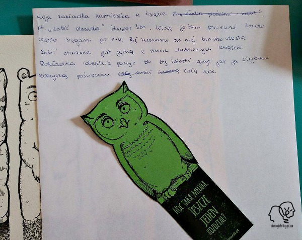 Zadanie przeprowadziłam w klasach licealnych i gimnazjalnych. Pojawiło się kilka nieznanych mi tytułów, ale większość znałam, choćby ze słyszenia. Część wypowiedzi mnie rozbawiła (np. “moja zakładka będzie mieszkać w każdej nowej książce, bo to pies włóczęga”), część wzruszyła (“moja zakładka zamieszka w książce “Zabi drozda”, bo często do niej wracam”). Wszystkie uważam za bardzo wartościowe, bo szczere.
