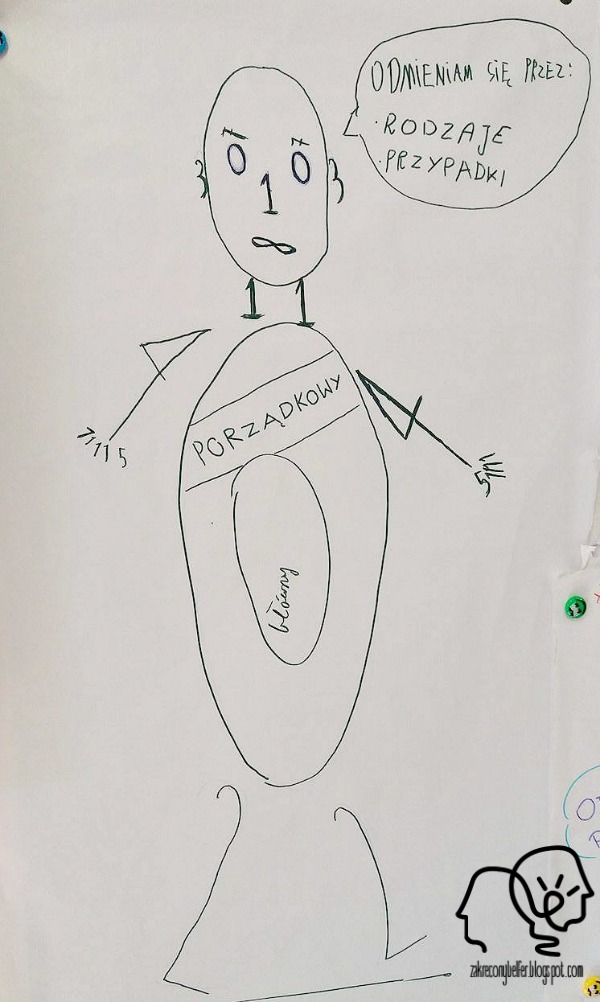 W dalszej kolejności sporządziliśmy tabelkę, w której zaznaczyliśmy która część mowy przez co się odmienia. Starszaki, które miały dwie godziny pod rząd, wykonały dodatkowo plakaty. Każda część mowy miała się przedstawić, wpisując to, co istotne w komiksowe chmurki. Powiem uczciwie, że pan liczebnik powalił mnie na kolana. Kreatywność na najwyższym poziomie 🙂