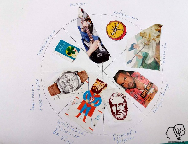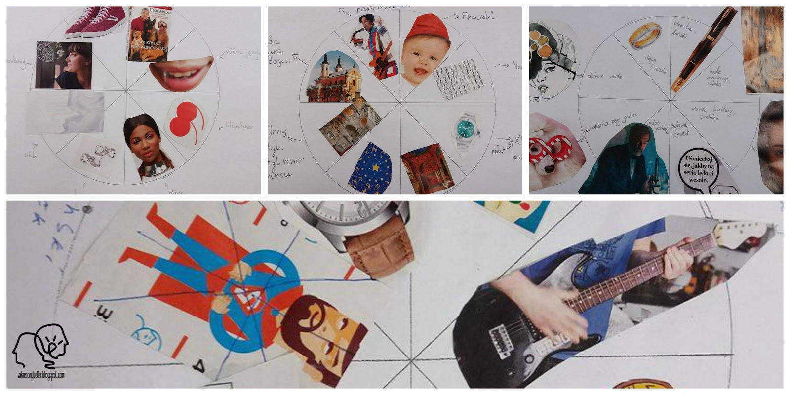 Każdy z uczniów otrzymał kartkę z narysowanym okręgiem, przedzielonym na osiem równych kawałków (całkiem jak w pizzy). Dodatkowo dzieciaki miały dostęp do kolorowych magazynów, z których wycinały interesujące je obrazki (stały się one naszymi składnikami). Polecenie brzmiało następująco: