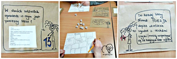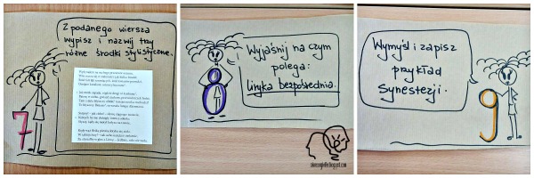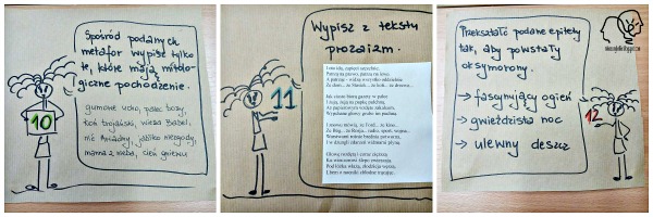Wymyśliłam, że przygotuję tyle zadań, ilu mam uczniów w klasie (to tylko czternastka, gdyby było ich więcej prawdopodobnie pracowaliby w parach lub grupach). Ustawiłam ławki w długi rząd, aby łatwo było się przesiąść na krzesło obok i przykleiłam do blatu każdego stanowiska polecenie. Przez wzgląd na znaczne ograniczenie czasowe, zadania były krótkie, lecz dobrze przemyślane. Sprawdzały zarówno umiejętności jak i wiedzę teoretyczną.
