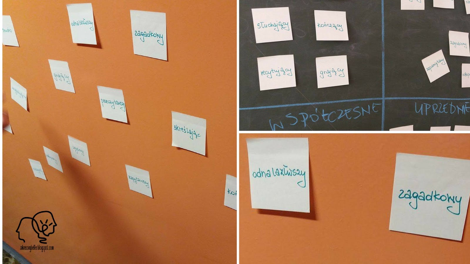 W mojej wersji klasa została podzielona na cztery zespoły. Każdy zespół miał za zadanie odnaleźć na ścianie inne imiesłowy (odpowiednio: przymiotnikowe czynne lub bierne oraz przysłówkowe współczesne lub uprzednie). Uczniowie sami decydowali, kto w grupie będzie odpowiedzialny za notowanie, a kto za zapamiętywanie i dyktowanie. Dla utrudnienia, wśród słów do wyboru znalazły się również takie, które wcale nie były imiesłowami (m.in. rzeczowniki, imiesłowy, przymiotniki).