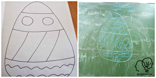 Doszłam do wniosku, że czwartoklasistom dobrze zrobi powtórzenie dotyczące części mowy. Narysowałam na kartce pisankę, powieliłam ją i poprosiłam, by uczniowie posłuchali przygód Kędzierzawego Karolka i w odpowiednie miejsca rysunku wpisali określone słowa (na tablicy opisaliśmy dokładnie schemat i dla przypomnienia umieściliśmy pytania, na które odpowiadają wymagane wyrazy).