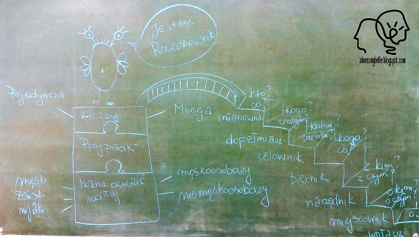 Jak się już pewnie domyślacie, w końcu i do mnie zajrzał Ozo, by pomóc uczniom w nauce. Zaplanowałam, że za sprawą tego małego spryciarza przypomnimy sobie wiadomości o rzeczowniku. Rozpoczęliśmy od sporządzenia rysnotki, w której Rzeczownik przedstawił się. Przyjął postać sympatycznego stwora, stojącego na puzzlach z informacjami. Do klocków prowadziły schody, na których zapisane zostały nazwy i pytania kolejnych przypadków.